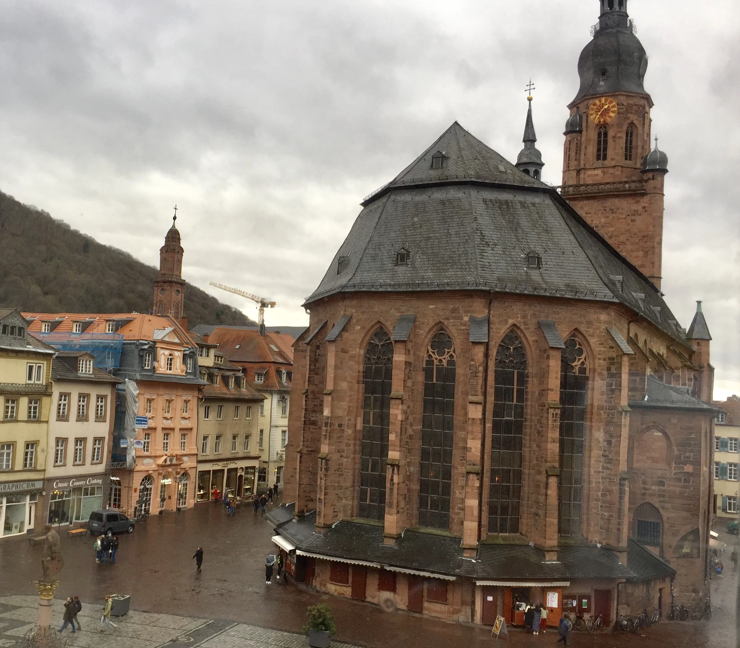 Die Hauptstraße führt an ihrer Längsseite vorbei. Auf der gegenüberliegenden Seite steht das älteste erhaltene Wohngebäude Heidelbergs, das Hotel zum Ritter.
